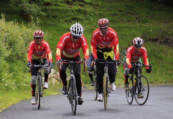 6月9日,車隊進入環(huán)法騎行第二階段,進入中央高原,開始登山之旅。本賽段最高處海拔達1451m,同時終點設(shè)立于山頂,騎行距離189公里。當天最激動人心的是攀爬著名二級坡蘇佩貝斯(Super-Besse),車隊中擅長登山的隊員如徐鵬云、范忠華、余國亮、金曉明等開始施展拳腳。爬坡是陳妙林董事長的弱項,但他只落后最先登頂?shù)男禊i云10分鐘時間,也是超級強。沖上海拔1451米的蘇佩貝斯坡后,樓忠兵問陳總感覺如何?有沒有當年在川藏線上爬坡的感覺?陳總說,爬坡是他的弱項,所以沒有沖在前面。環(huán)法賽道和川藏公路都是世界上難度最高、同時又是自然風景最美麗的自行車賽段。相對于環(huán)法,川藏線的特點是路況差,又是高海拔,高原反應(yīng)嚴重。但在騎川藏線時,用的是山地車,爬坡就相對輕松些。陳總說,這次環(huán)法用的賽車,都是公路車,而且是前盤只有兩個檔位,爬坡的難度就比川藏線要大了。陳總其實帶來了一輛前盤為三檔的公路車,但他說兄弟們用的都是兩檔車,他怎么能用三檔車呢。樓忠兵因此在博客里大贊: “真是了不起啊!”