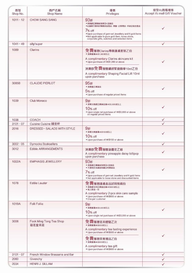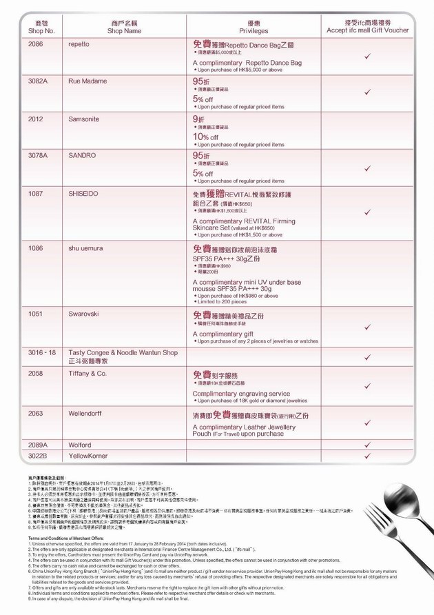 由2014年1月17日至2月28日期間,銀聯(lián)卡持卡人于香港ifc商場尊享以下雙重禮遇!