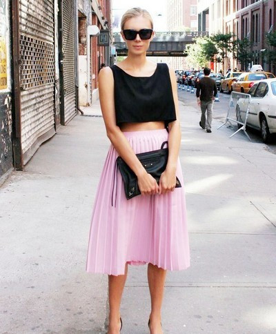 百褶裙搭配要點:黑色crop top + 粉色百褶裙半身長裙+ 粉色柳丁平底鞋+黑色手拿包 +墨鏡