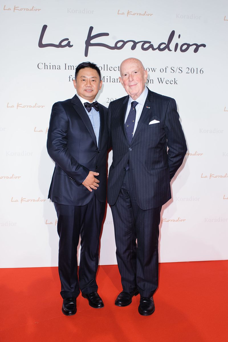 珂萊蒂爾股份有限公司董事長金明先生和國際時尚泰斗意大利全國時尚協(xié)會、米蘭時裝周名譽主席Mario Boseli先生合影
