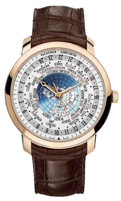 腕表以18K 5N粉紅金材質(zhì)打造,尺寸為42.50*11.5mm,以圓潤的造型、貴金屬的材質(zhì)延續(xù)了雍容華貴的風(fēng)格。表盤以蘭伯特投影型的世界地圖作為大背景,可以指示37個(gè)時(shí)區(qū)的世界時(shí),足以體現(xiàn)它功能上的強(qiáng)悍。藍(lán)寶石水晶表鏡也很有特點(diǎn),有一半的采用了藍(lán)色調(diào),表盤每24小時(shí)旋轉(zhuǎn)一圈,通過顏色就可以分辨出哪里是黑夜哪里是白天。
